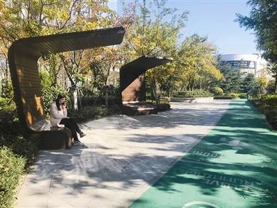 这一点也在海尔路口袋公园和海伦路街道的口袋公园设计上得到了印证。“海尔路目前从南向北利用道路东侧近50米宽的绿化带已经建设了7处口袋公园,建设了两条绿道,一条用来供体育爱好者跑步锻炼,另一条则供附近社区居民休闲遛弯。在金狮广场附近的口袋公园里,除了两条绿道外,还设置了座椅区、儿童娱乐区以及健身器材区,这都是充分调研周边社区居民以及写字楼工作人员的需求而设计的。另外在海尔路西侧六十七中门口两侧结合校园环境也完成了两处口袋公园建设。”曲有说。