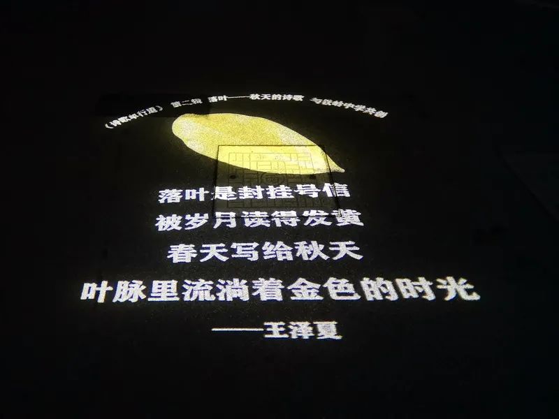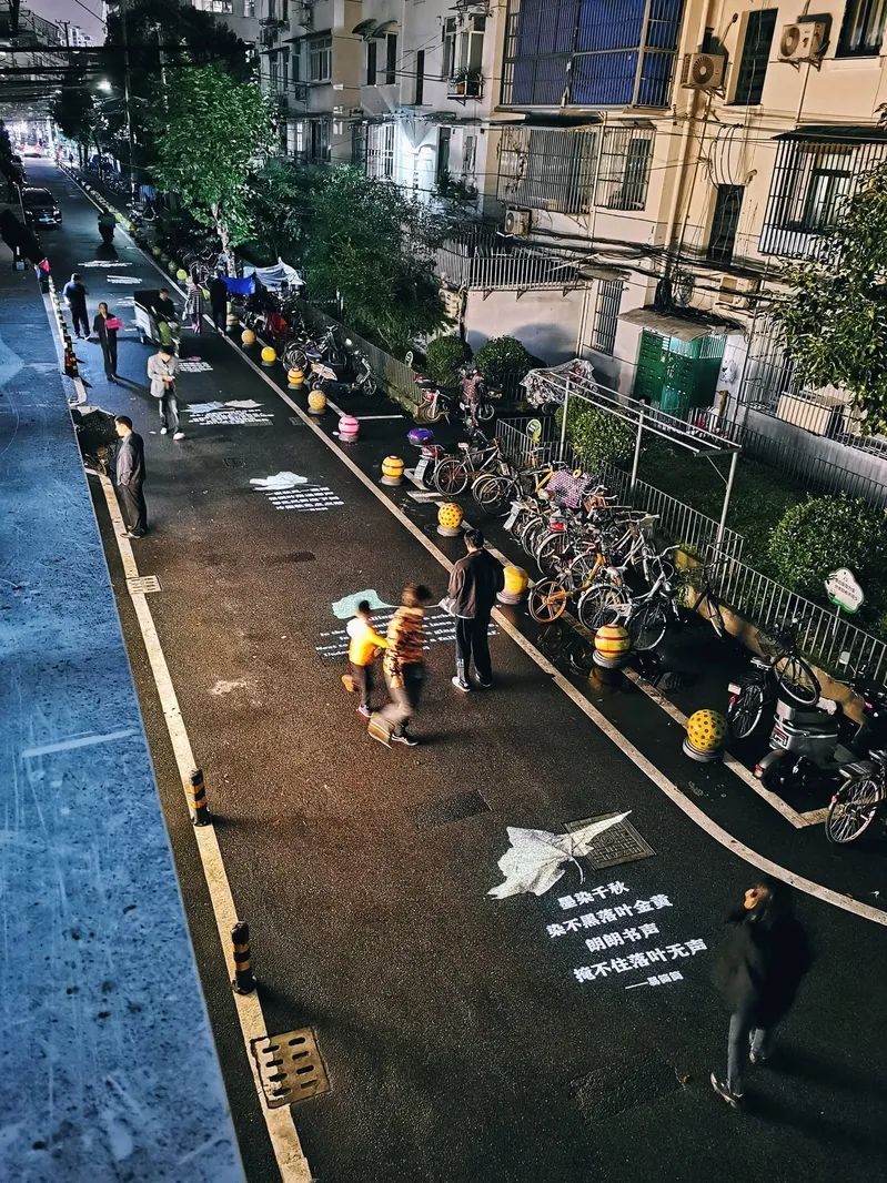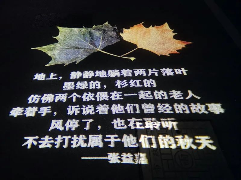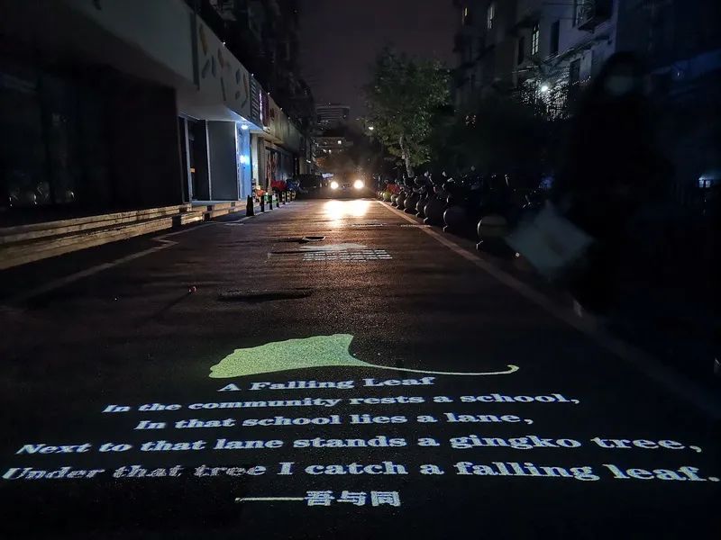 11月中旬,“诗歌单行道”迎来第二季,主题为“落叶与诗歌一起飘落”。1028弄的单行道上,不同姿态与品种的斑斓树叶被投影在地上,每片落叶下方是一首充满秋意的小诗,创作者为13岁左右的学生。
