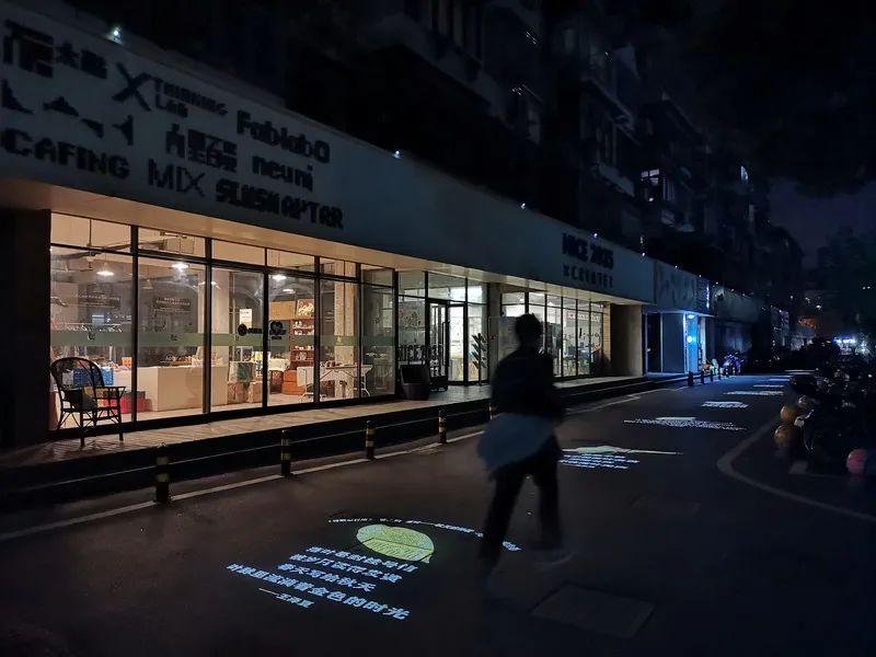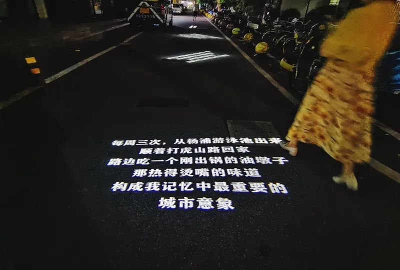 最初的灵感来自大学路。“大学路上有很多商户,会把自己的店招用投影灯投射到地面。”受此启发,郑露荞和熊子超在大学路和旁边的锦嘉路上尝试了1.0版的“诗歌单行道”。在一年中的元宵、中秋等节日,邀请艺术家和商家共同创作与时令节日契合的诗歌。