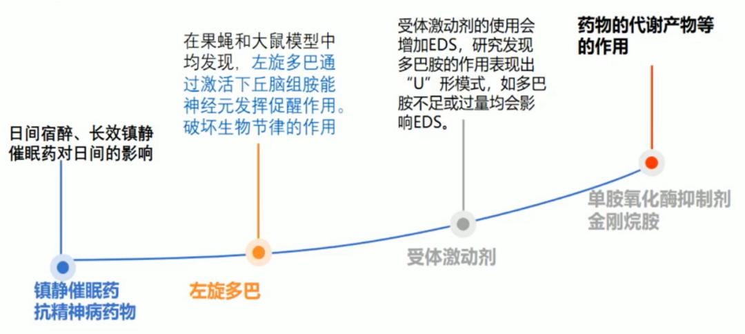 ④莫达非尼、哌甲酯、肾上腺受体激动剂(如咖啡因、伊曲茶碱)、羟丁酸钠均有病例报道显示可改善PD患者的EDS,但需要大样本研究验证。