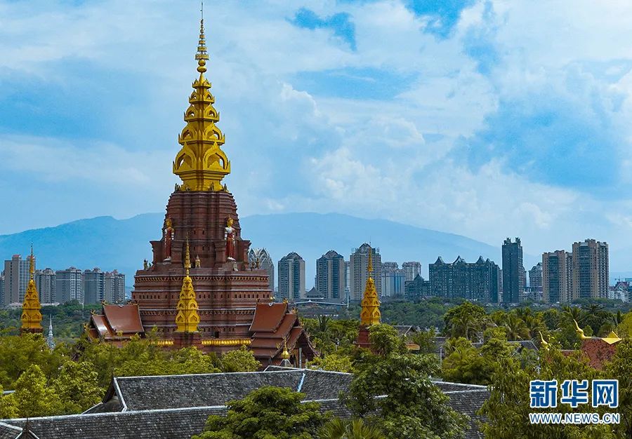 矗立在蓝天白云下的大金塔更显庄重威严(资料图)。新华网发(告庄西双景景区 供图)