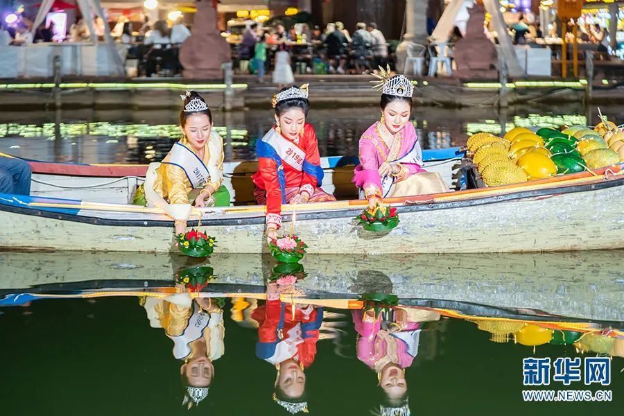 一盏盏承载着美好心愿的水灯点缀了黑夜(2021年11月19日摄)。新华网发(告庄西双景景区 供图)