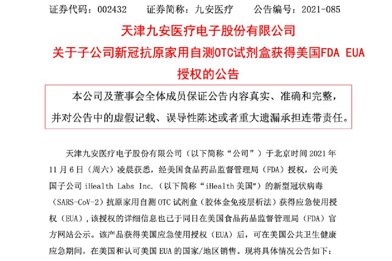 九安医疗连续大涨的股价还要从11月7日的一则公告说起。此前,九安医疗发布公告称,子公司新冠抗原家用自测OTC试剂盒获得美国FDA EUA授权。该产品获得美国应急使用授权(EUA)后,可在美国公共卫生健康应急期间,在美国和认可美国EUA的国家/地区销售。