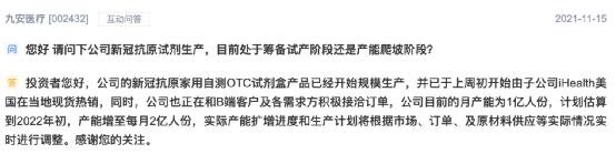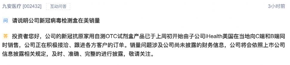 此外,九安医疗还多次在互动易平台上回复投资者,“公司的新冠抗原家用自测OTC试剂盒产品已于上周初开始由子公司在美国向C端和B端同时销售。”