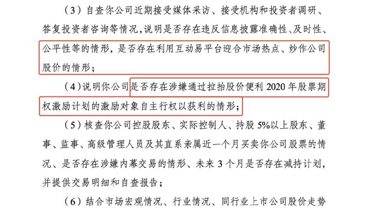 同时,要求公司说明是否存在涉嫌通过拉抬股价便利2020年股票期权激励计划的激励对象自主行权以获利的情形;是否存在涉嫌内幕交易等情形;详细分析你公司近期股价大幅上涨且明显偏离大盘的原因,并进行充分的风险提示。