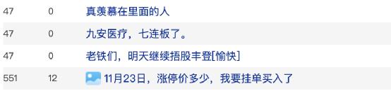 而下午的时候大家还沉浸在7连板的欢乐之中,不少投资者后悔卖早了,羡慕依然持有九安医疗的人。