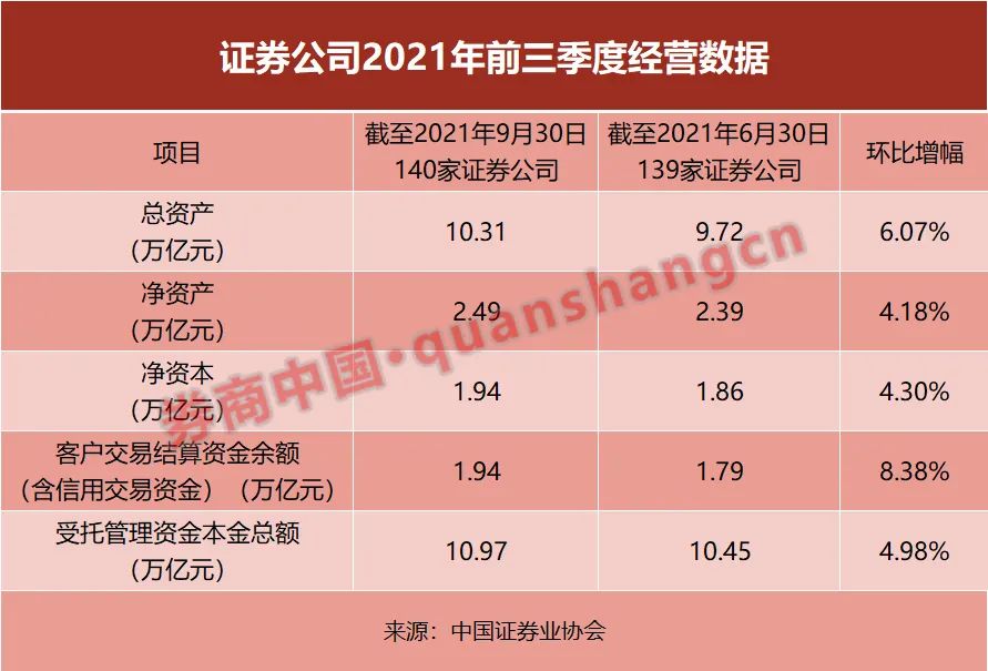 中国证券业协会近日公布的数据显示,截至今年三季度末,140家证券公司总资产已突破10万亿元,达到10.31万亿元。