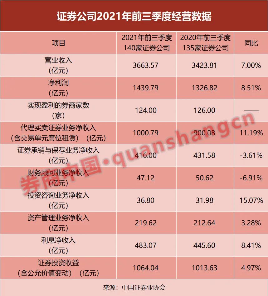 数据显示,2021年前三季度,140家证券公司实现营业收入3663.57亿元,同比增长7%;实现净利润1439.79亿元,同比增长8.51%。前三季度共有124家证券公司实现盈利。