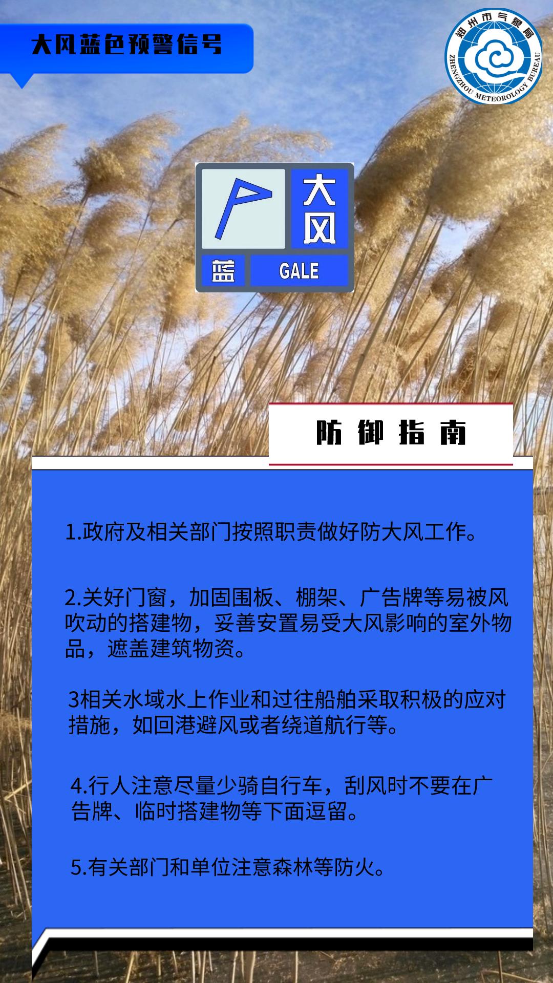 郑州市气象台11月24日08时50分发布大风蓝色预警信号:预计未来24小时内,郑州市区、巩义、荥阳、登封、新密、新郑、中牟、航空港区将出现4到5级偏西风,阵风7级左右。请注意防范。