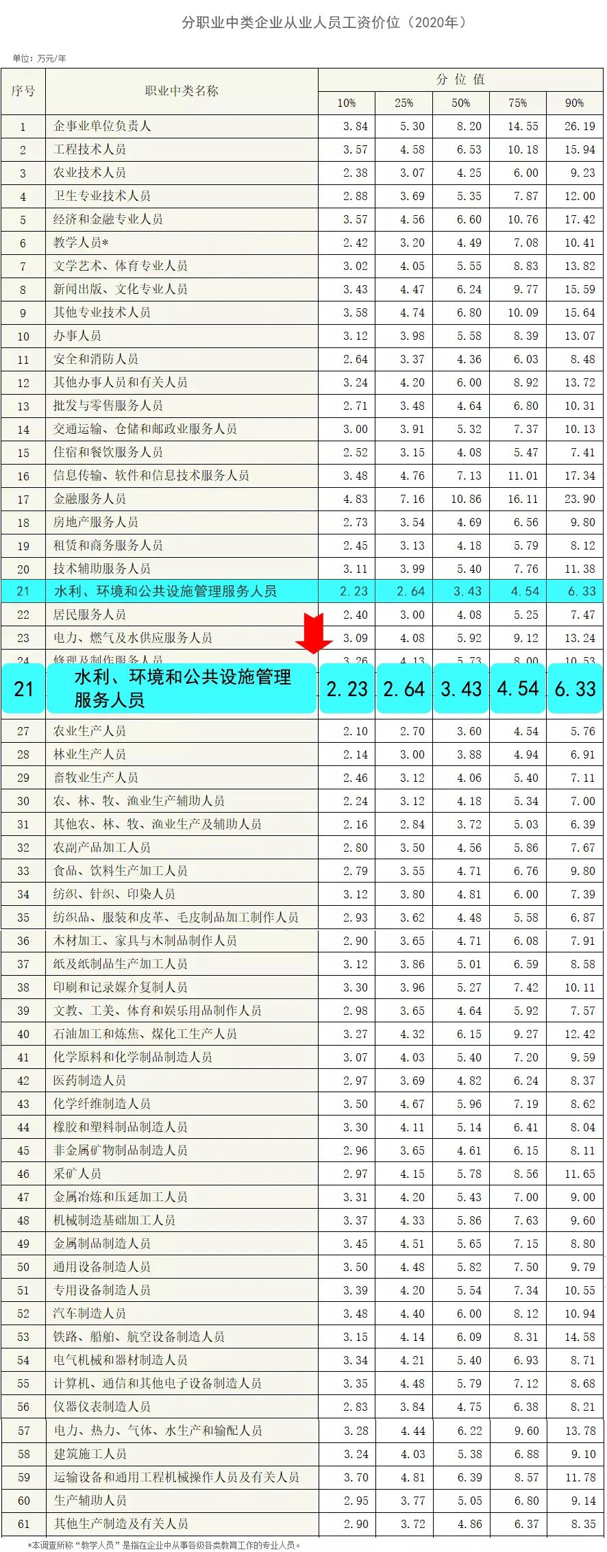 具体到从事水利、环境和公共设施管理服务人员,只要在2019年年薪超过3.36万元、2020年年薪超过3.43万元,就能跑赢同行业一半的从业人员。