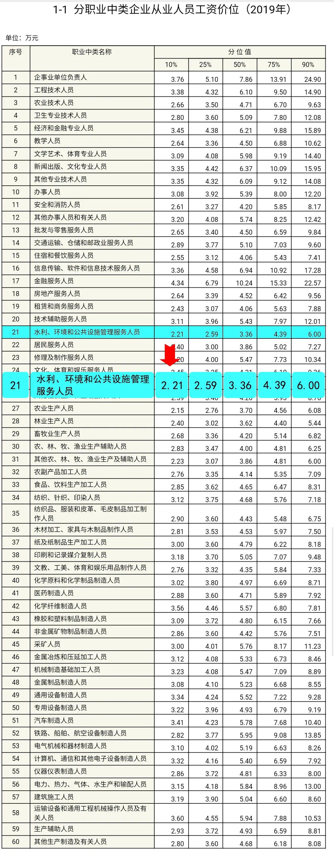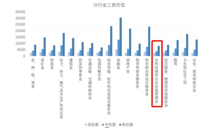 根人社部公布的数据,从工资价位高位数(P90)来看,从事水利、环境和公共设施管理服务人员的工资水平排倒数第二,年工资为6.33万元,仅比同一分位下从事农业生产人员的年工资高0.57万元。