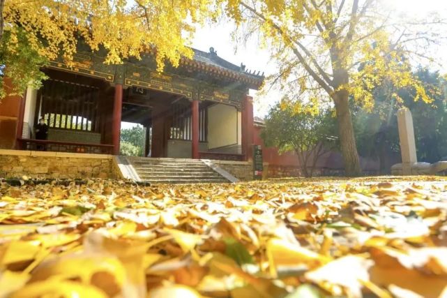 银杏叶从枝头飘落,金黄色的叶片为青石板铺上了一层厚厚的“金色地毯”,让人不忍踏足。
