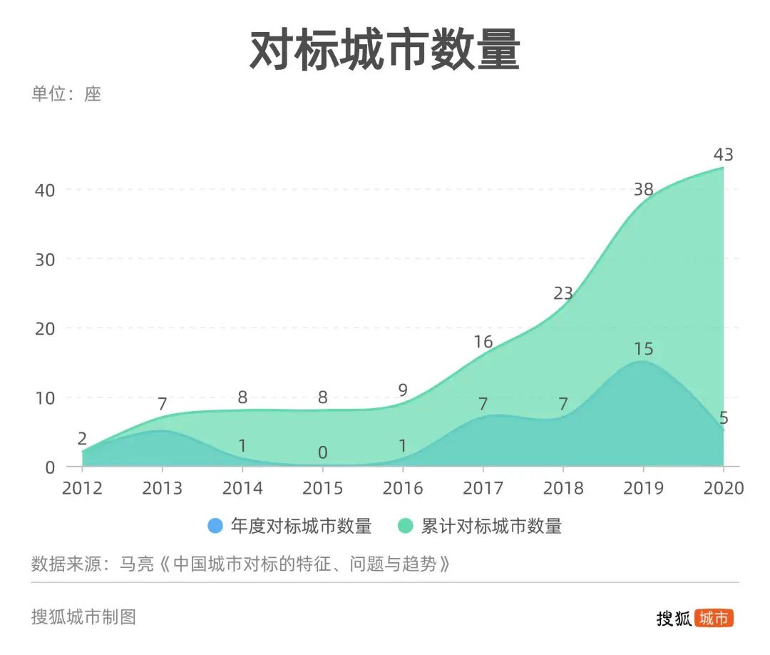 最早是2012年河北省的一些城市在进行对标,当年唐山市和邯郸市都提出对标天津市。近些年来对标的城市数量在逐年增多,特别是2018年以来山东省全部16个城市都开展对标,使对标城市的数量大幅提升。2020年初新冠肺炎疫情爆发,城市对标的新增趋势有所放缓, 2021年暂时没有新增对标城市。