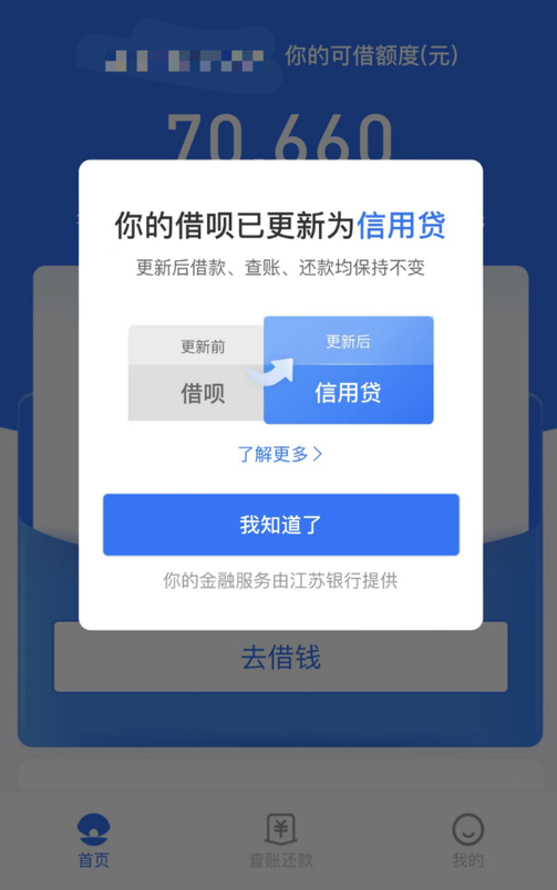 记者了解到,不久前,同属蚂蚁消金公司的借呗也已启动品牌隔离工作,由银行等金融机构独立提供的信贷服务更新至“信用贷”页面展示。