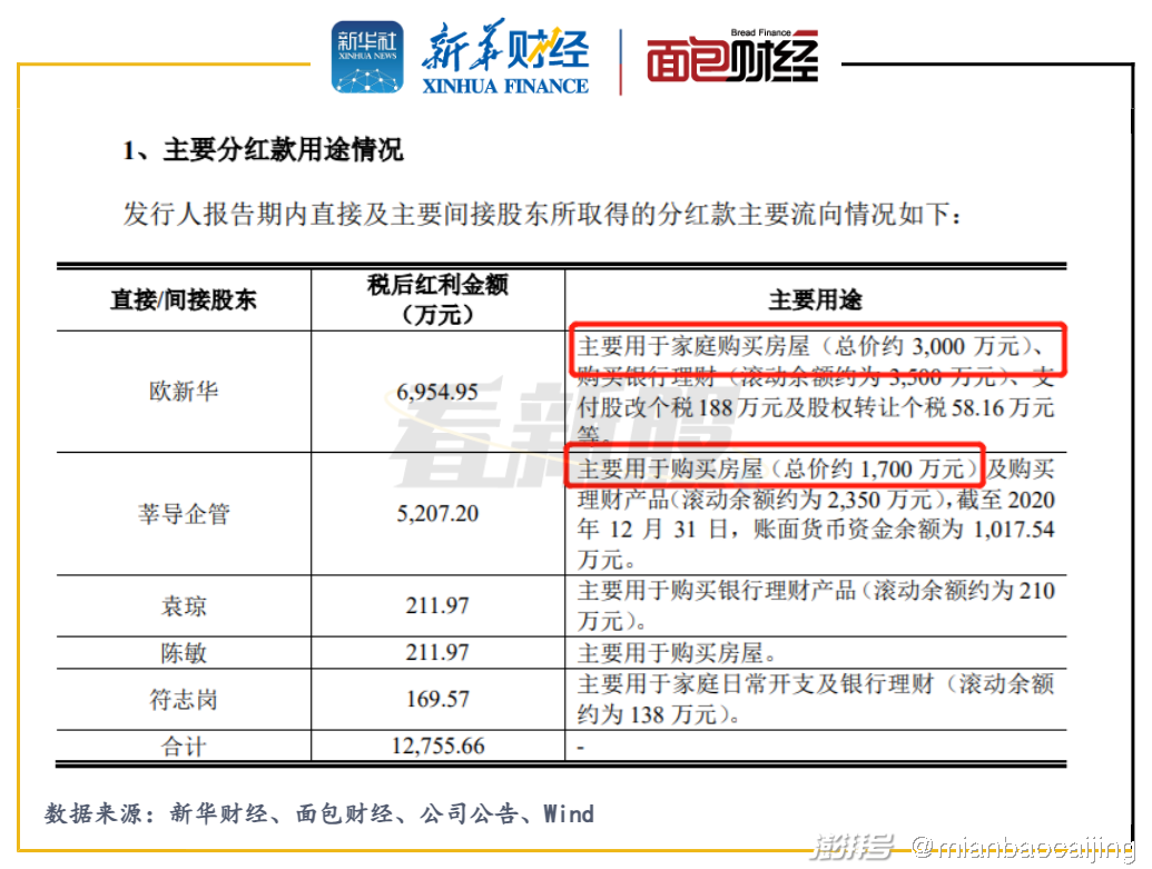 值得关注的是,上市之前的近三年间,公司合计向股东分红1.47亿元,其中,公司实控人欧新华和其独资控股的莘导企管合计获得1.34亿元,欧新华将3000万元用于家庭购房。