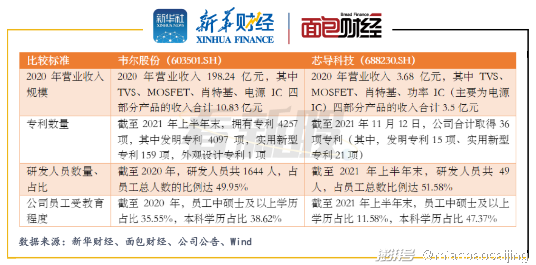 图6:芯导科技与韦尔股份在经营情况、研发能力等方面比较情况