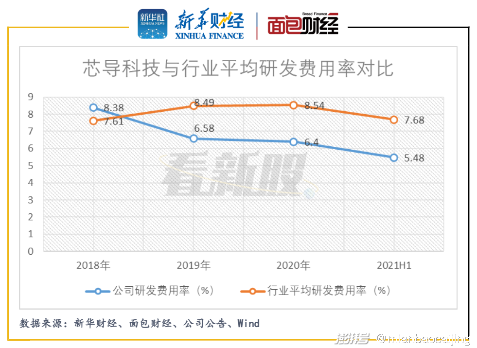 另外,2018年至2020年,最近三年芯导科技的累计研发投入占期间累计营业收入比例为7.07%。近年来公司研发费用率呈下滑趋势且逐渐低于行业均值。