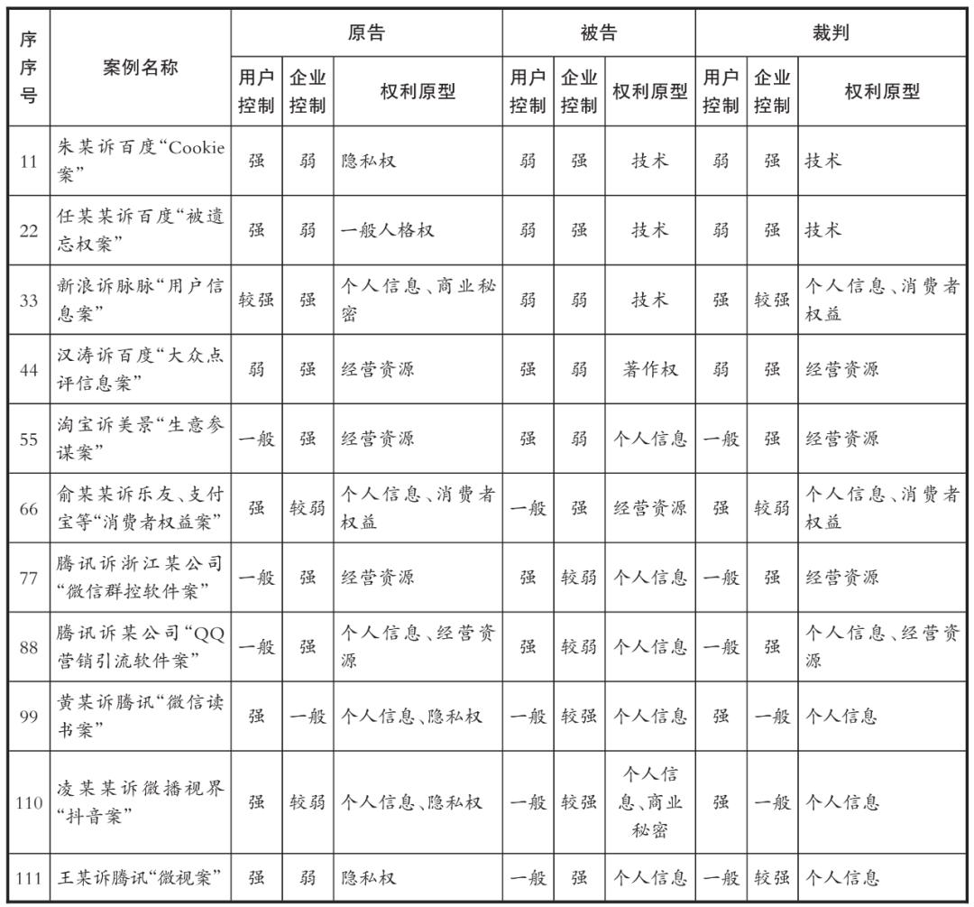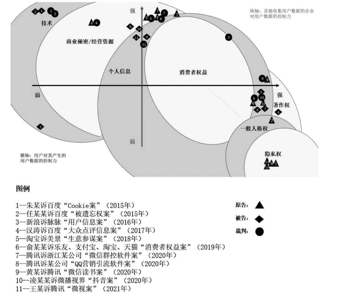 然而若以“事实与规范”的棱镜观之,数据权利概念仅表明了权利与数据有关的意涵,她仅是一个描述性概念,而在规范意义上是模糊的。简言之,当我们使用这一概念时所表达的是数据作为权利客体的事实,但每一言说者在表达数据权利时所指向的权利应有内涵则各不相同。如此一来,数据权利概念就呈现出第一重“事实与规范”的鸿沟:从数据作为权利客体的事实,无法推导出规范意义上的数据权利的内涵应该是什么。这反映了哲学上的“是-应该”问题在新兴权利话语命题上的延续。“是”与“应该”的界分是近代西方哲学的重要议题,最早由英国哲学家大卫·休谟在1740年出版的《人性论》一书中提出,认为以“是”或“不是”作联系词的命题推导不出以“应该”或“不应该”作联系词的命题。法律领域解决权利的“是-应该”问题,似可更多地关注“是”所面向的权利实践而归纳出权利的特征,如此即便“是”与“应该”无法逾越但也可缩窄两者之鸿沟。法律实践的立场要求所有权利主张必然以实定法为依据,因此数据权利实践必然在实定法中有对应的权利原型,而多元、混沌的数据权利实践则进一步开示了数据权利的“事实与规范”第二重鸿沟:纷繁复杂的数据权利实践事实,无法推导出确定数据权利原型的规范性标准。本文选取近7年有关数据权利实践的11个典型民事诉讼案件作为本文的观察和讨论样本。表1和图1展示了11个案件中的原告、被告和裁判者在用户对其产生的用户数据的控制力、直接收集用户数据的企业对用户数据的控制力以及数据权利原型辨识等三方面的认知事实。