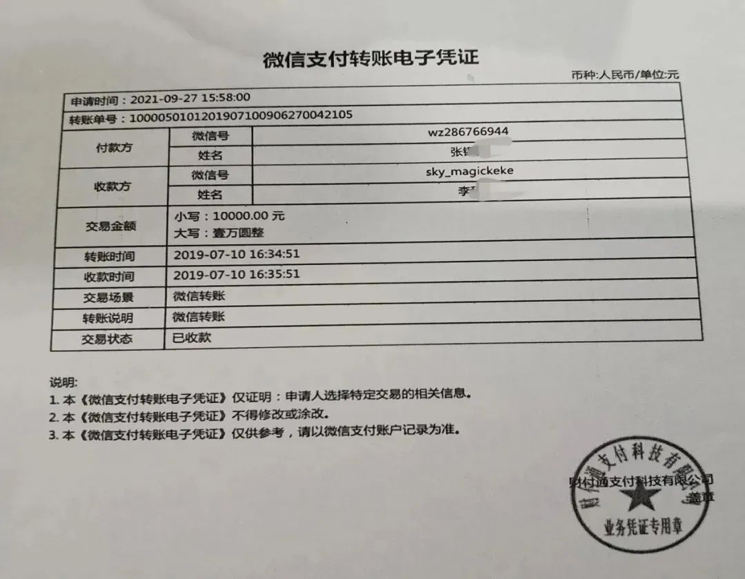 经反复尝试,张某通过微信账号绑定的实名认证的手机号码,证明了自己确系借款方微信号的持有人。并通过微信账单“申请转账电子凭证”功能,得到了一张显示有原、被告完整姓名的凭证。