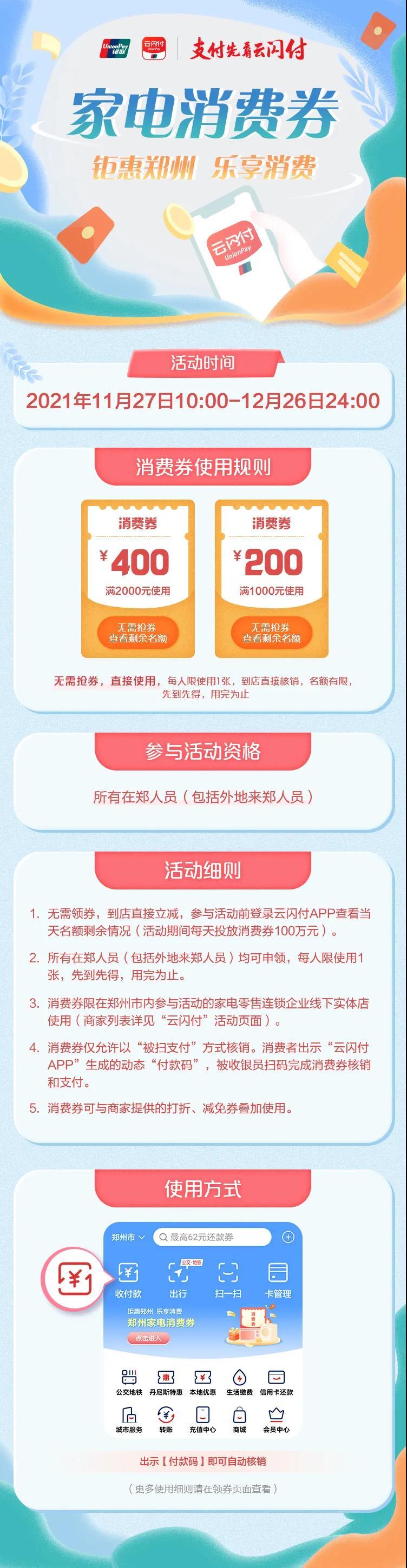 本次家电消费券将以电子消费券形式发放,所有在郑人员(包括外地来郑人员)通过银联“云闪付APP”活动页面均可参与活动。此次共计发放3000万元,分为200元券、400元券两种,总计12.5万张。其中,200元券10万张,400元券2.5万张。