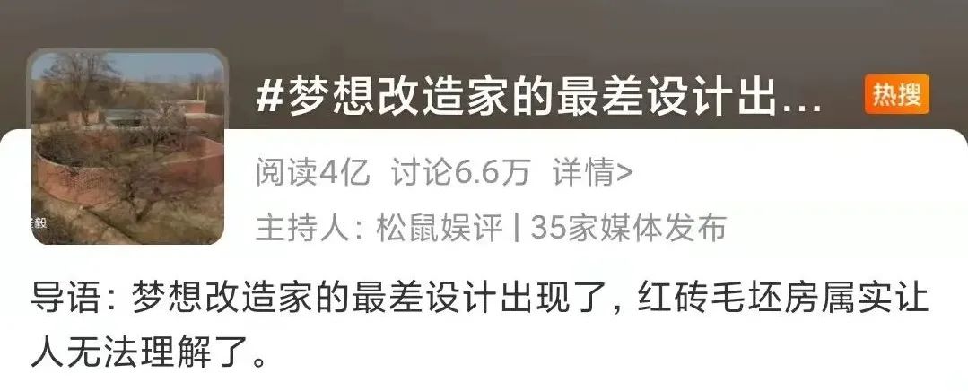 11月21日,话题“梦想改造家的最差设计出现了”迅速冲上微博热搜榜。节目组口中所谓“甘肃农村土房重建后变梦幻田园居”,在网友看来其实是“132万改造老屋成红砖毛坯房”,其中落差引发全网热议。
