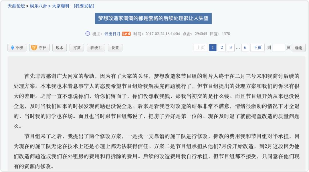 另一桩“悬案”发生在2017年初,一位曾参与《梦想改造家》第三季的业主在天涯论坛发帖,控诉房屋改造中的质量问题,表示设计与施工方面均存在缺陷。业主与节目组沟通不畅,双方各执一词,是非难辨。