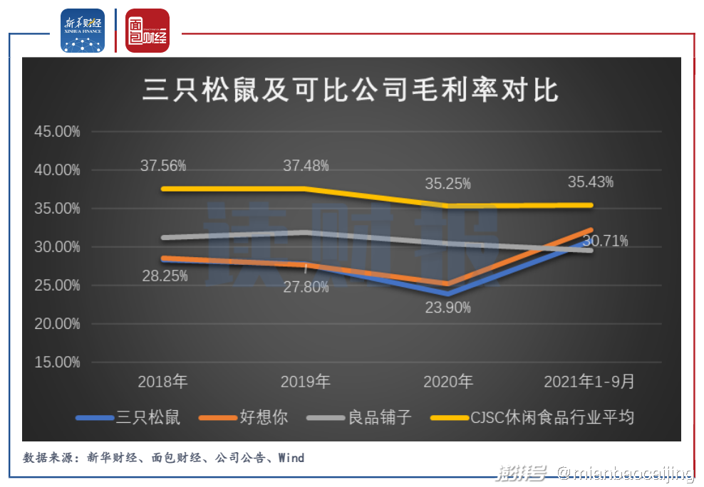 除了产品质量问题,代工模式的成本控制也不如自主生产企业。2021年前三季度,三只松鼠毛利率为30.71%,较同行业平均毛利率低约4.7个百分点。