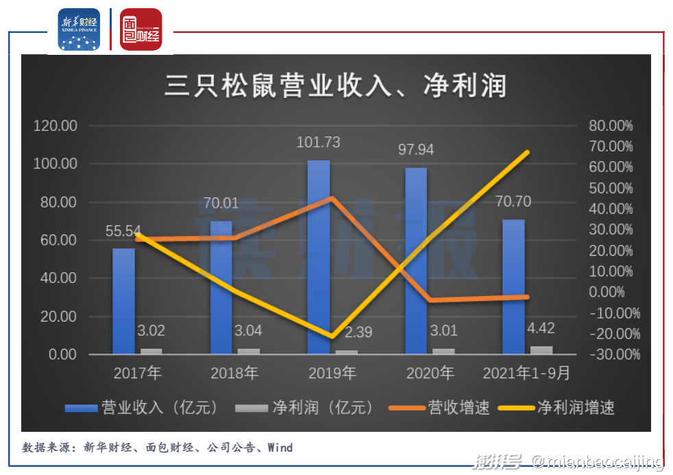 图3:2017年以来三只松鼠营业收入、净利润