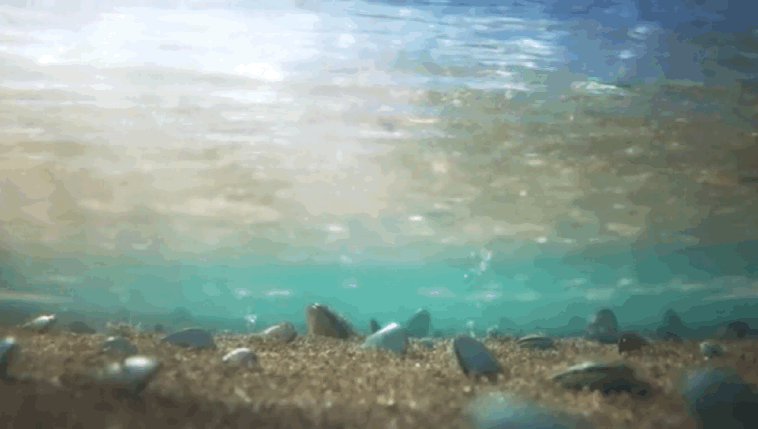潮起潮落中,扇贝搁浅在海滩上,