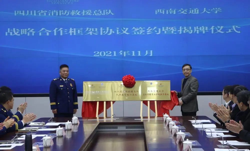 在与会人员的共同见证下,朱健梅、马涛代表双方签署战略合作框架协议,杨丹、农有良为“火灾科学与消防工程实验室”“四川省消防救援总队人才教育培训基地”“西南交通大学消防工程专业实践教学基地”揭牌。