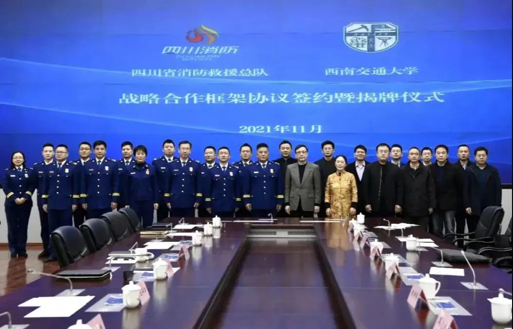 11月25日,西南交通大学与四川消防救援总队签署战略合作框架协议,并共同为“火灾科学与消防工程实验室”“四川省消防救援总队人才教育培训基地”“西南交通大学消防工程专业实践教学基地”揭牌。西南交通大学校长杨丹、副校长朱健梅,四川消防救援总队党委书记、政治委员农有良,总队党委委员、副总队长马涛、邹兴连,副政治委员王守江,总工程师陈硕,政治部主任钟廷渊出席仪式。