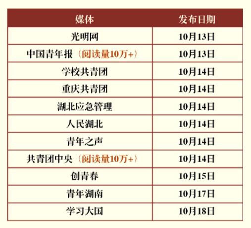 文章推送后,迅速引发中央及地方各级媒体平台的广泛关注。截至10月22日,共有12个校外媒体账号联系学校官方微信申请开“白名单”事宜,同时有68个账号直接分享。中国青年报、共青团中央推文均突破“十万+”的阅读量,引发社会广泛热议。