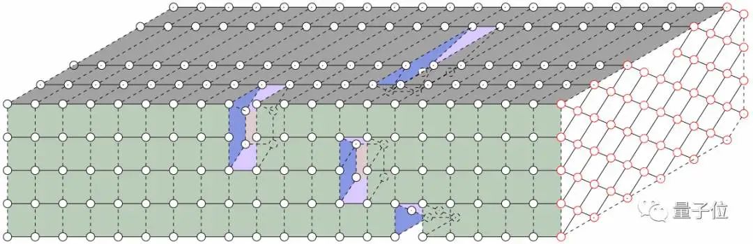 上图中,最左侧一层表示 53 个量子比特的初始状态,最右侧一层表示终止状态。新算法通过切断网络的一些连接来简化关系,从图像上看就像是在三维网络上“钻孔”。