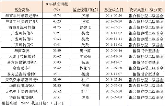Wind数据显示,截至11月26日,今年来全市场“固收+”基金中超九成取得正收益,平均回报率达4.59%,其中年内回报率超过10%的“固收+”基金有近200只,更有45只今年以来回报超过20%。