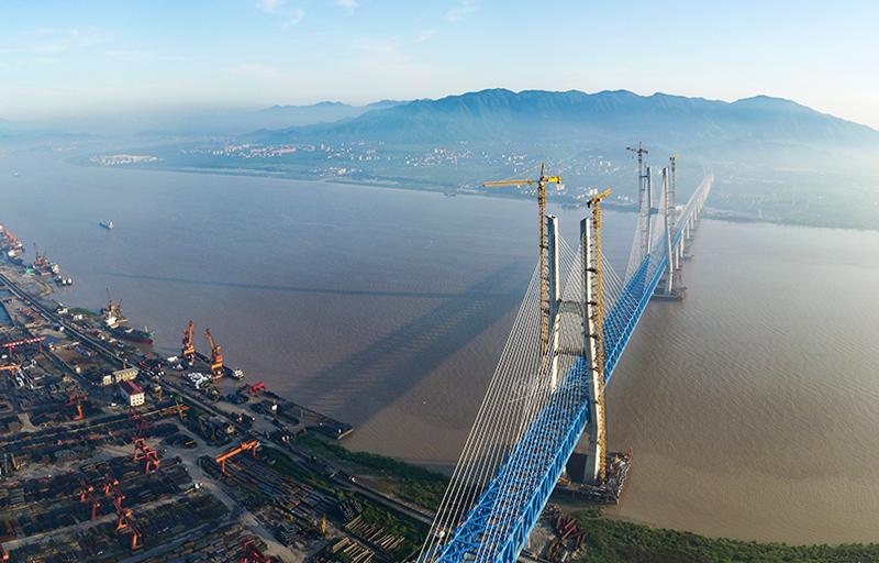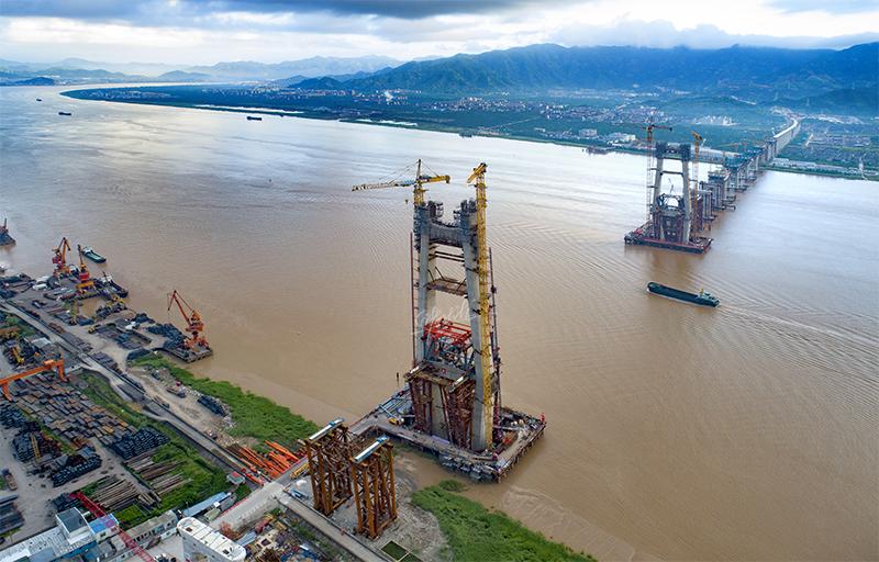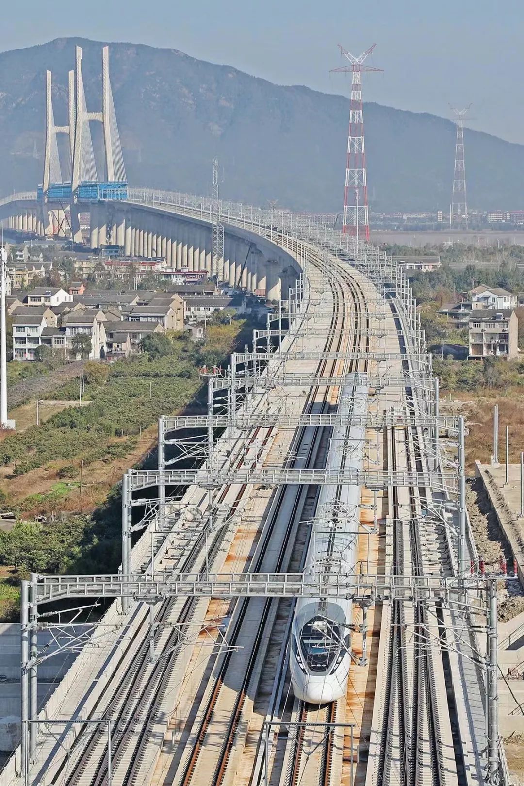 椒江特大桥由参建过港珠澳大桥等众多世界级桥梁工程的中铁大桥局承建。大桥全长5252.6米,其中主桥为(84+156+480+156+84)米双塔双索面四线钢桁梁斜拉桥,是国内最大跨度的四线高速铁路双主桁钢桁梁斜拉桥。