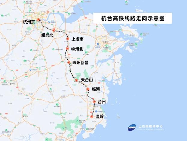 杭台高铁是国家沿海铁路快速客运通道的重要组成部分,连接杭州、绍兴、台州三地,北起杭州东站,利用杭甬高铁至绍兴北站,之后新建正线至台州市温岭站,设计时速350公里,线路全长约266.9公里,其中新建线路约226.3公里,设绍兴北、上虞南、嵊州北、嵊州新昌、天台山、临海、台州、温岭8个车站,每个站房都充分融合了当地特色文化元素,实现了“一站一景”。