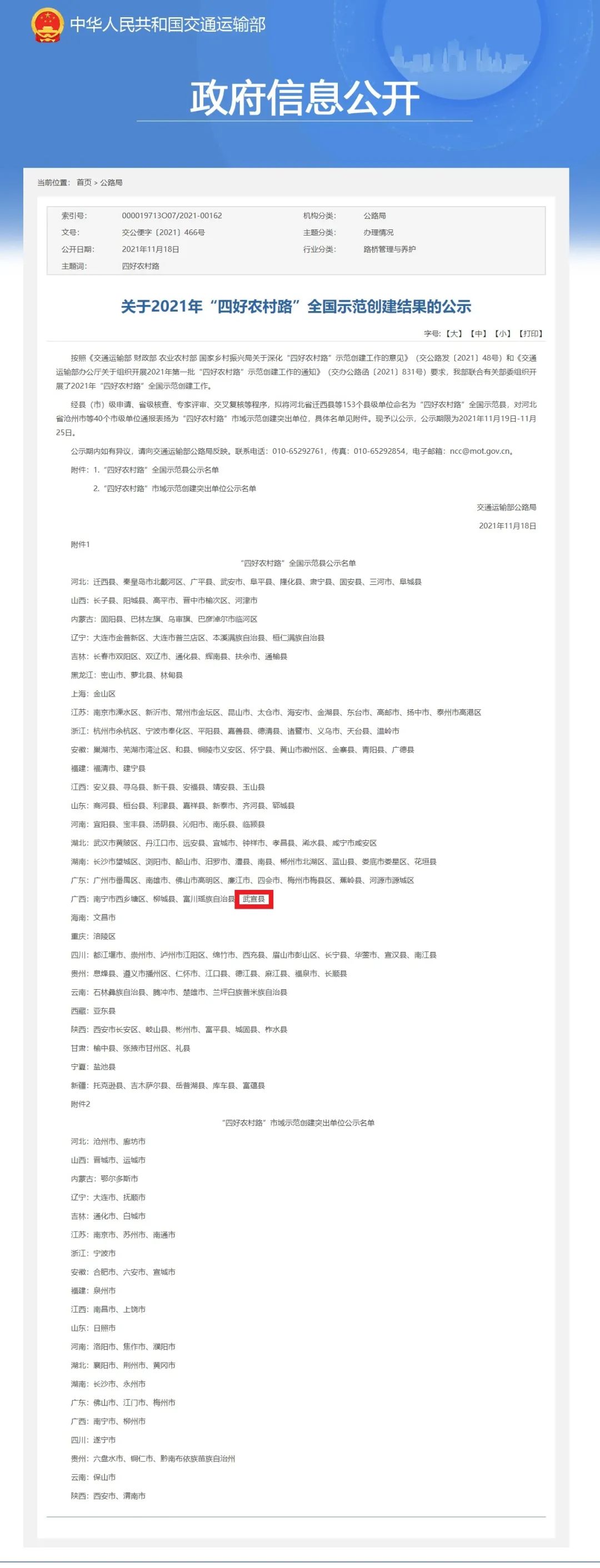 2021年“四好农村路”全国示范创建结果的公示,