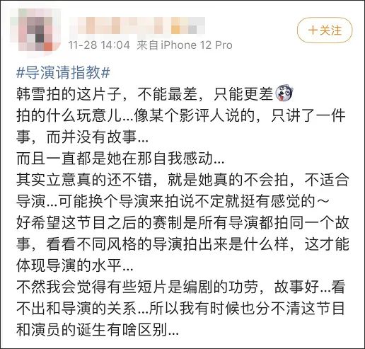 根据韩雪的介绍,这个故事是发生在她身上的真实故事,因此短片结束后,她几度泪奔。可现场,多数人都没能和韩雪“共情”,有观众直言,“这可能就是自我感动和感动的区别,(这短片)让我觉得20分钟特别蛮长”。