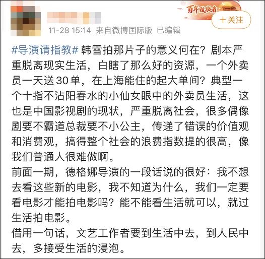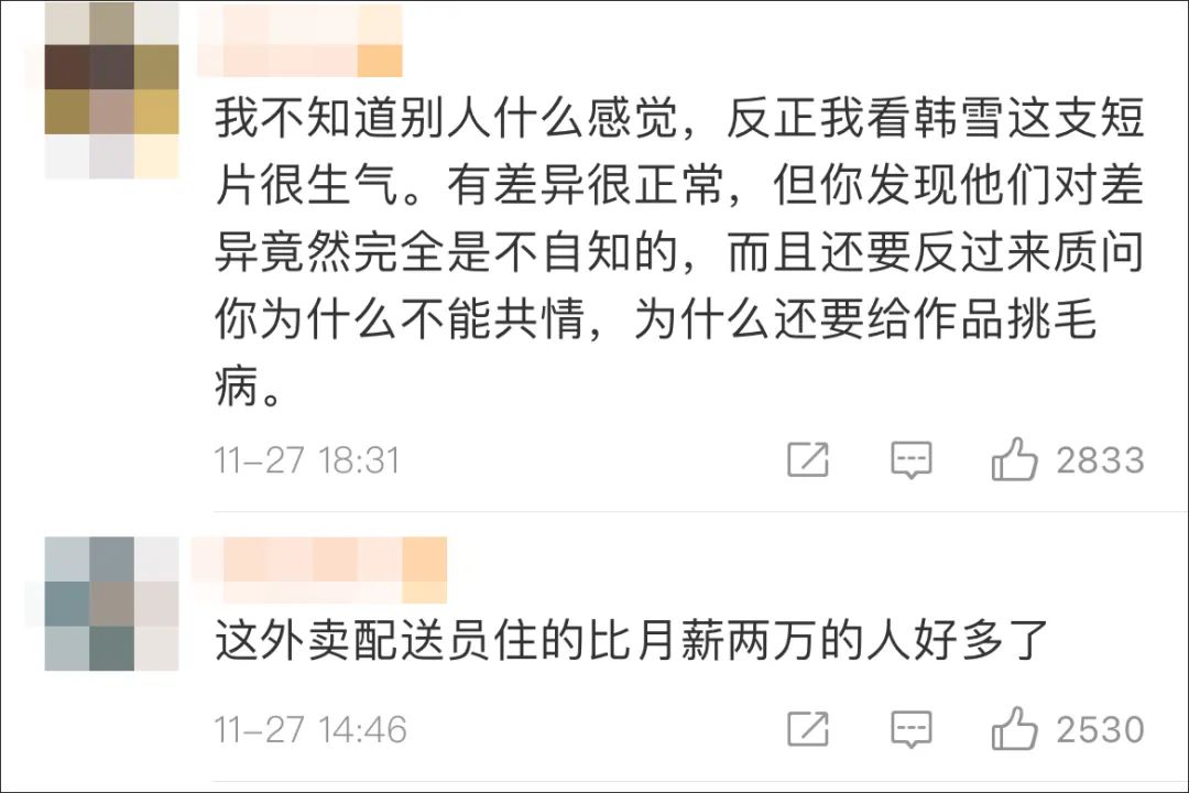 联系到本次外卖员入住月租近万房间的短片,有网友表示,现在的文艺工作者太脱离实际,没有描述生活的能力,真想要拍大众喜欢的电影,还是应该亲自去感受。