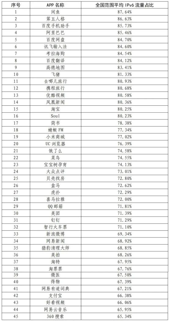 截至2021年10月,纳入监测范围的200款APP均支持IPv6访问,IPv6流量平均占比达39.77%,其中已有45款APP的IPv6流量占比超过65%,名单如下: