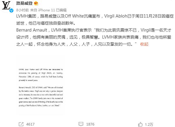11月29日凌晨,据路易威登微博,Virgil Abloh于11月28日因癌症逝世,他已与癌症独自奋战数年。