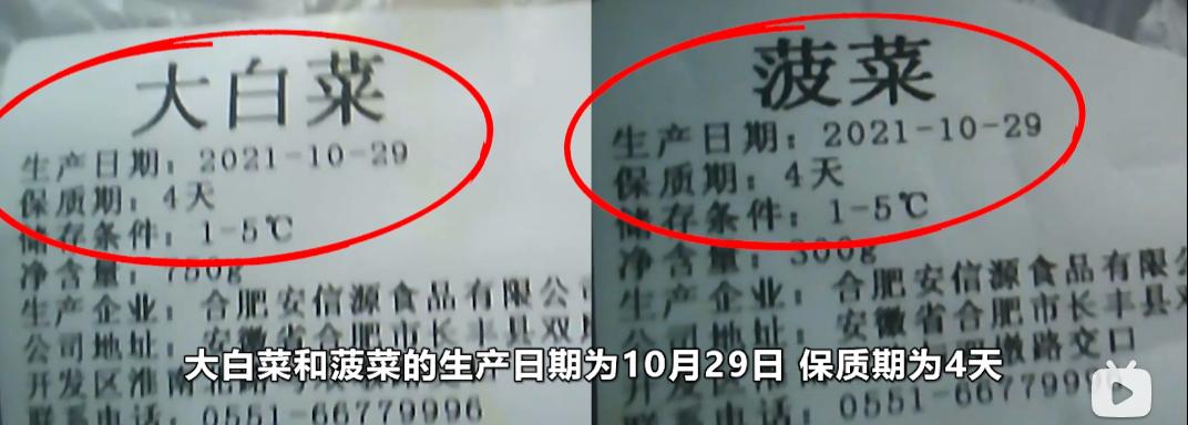 蔬菜方面,大白菜和菠菜的生产日期为10月29日,保质期为四天,员工在11月3日当天拿出使用时已经过期。