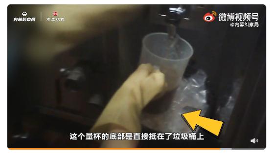 视频显示,员工在用量杯接 取肉老汤油时,杯子底部直接抵在了垃圾桶上,随后在捞取牛肉汤汁时,量杯则直接没入桶内。