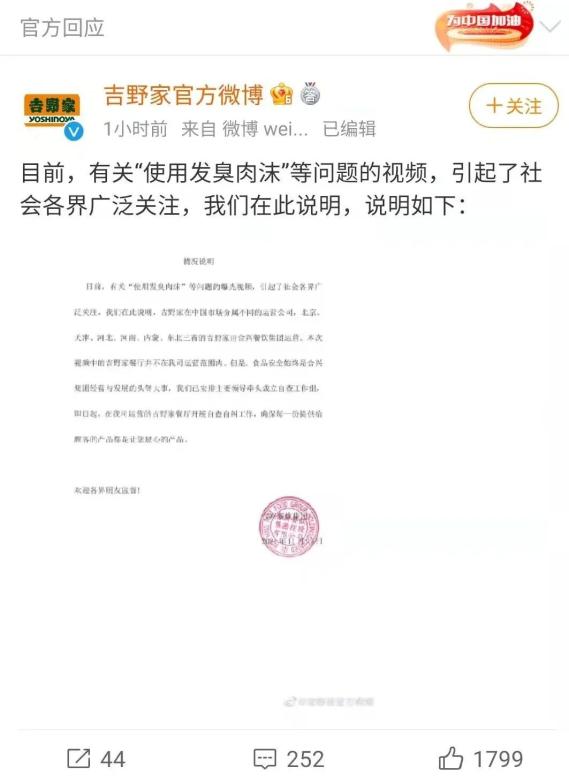 该视频发布仅两个小时,吉野家官方微博发布声明进行回应。这一署名为合兴餐饮集团的声明表示,吉野家在中国市场分属不同的运营公司,北京、天津、河北、河南、内蒙、东北三省的吉野家由合兴餐饮集团运营。本次视频中的吉野家餐厅并不在公司运营范围内。声明还表示,该公司已安排主要领导牵头成立自查工作组,即日起,在公司运营的吉野家餐厅开展自查自纠工作。
