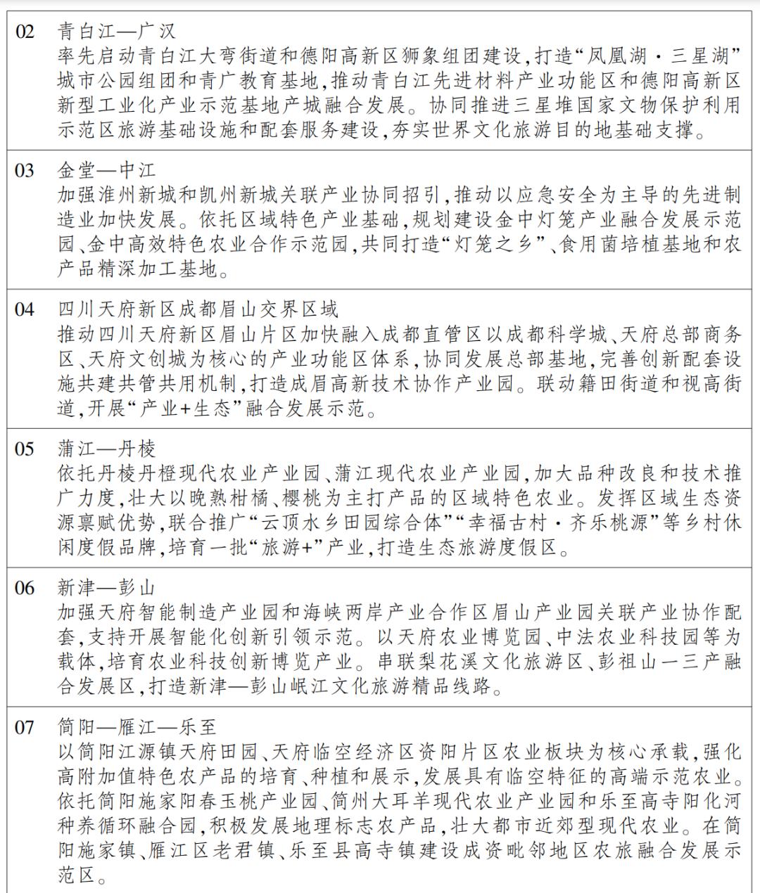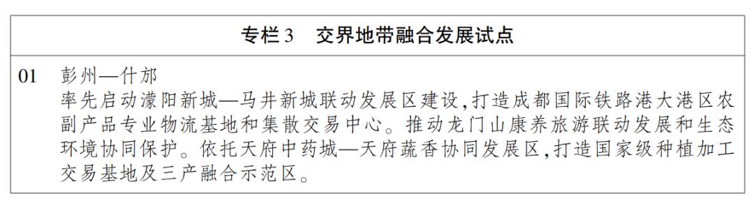 《规划》提出,要发挥成德眉资毗邻地区经济联系紧密、人文交往频繁的比较优势,推动交界地带在规划布局、交通连接、产业协作、政务服务等方面探索创新合作模式,打造同城化发展若干支撑点。支持彭州-什邡、青白江-广汉、金堂-中江、四川天府新区成都直管区和眉山片区、蒲江-丹棱、新津-彭山、简阳-雁江-乐至等区域开展交界地带融合发展试点,推动其他交界地带融合发展。