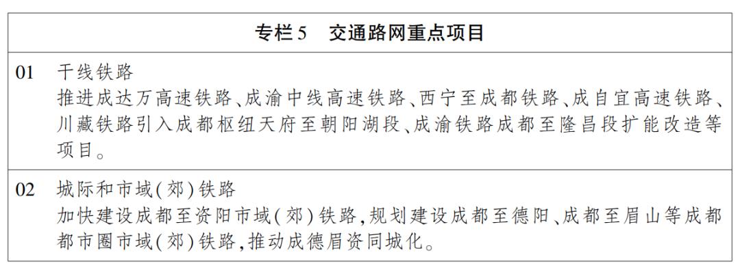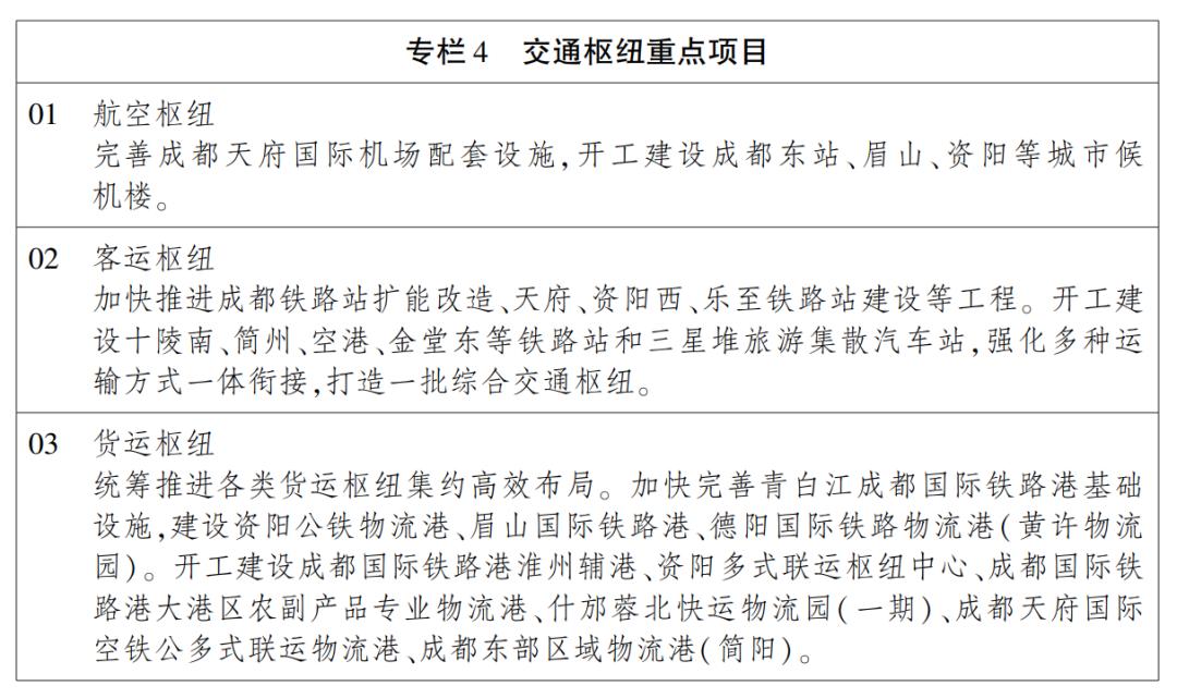 在提升国际门户枢纽能级上,《规划》提到,推动成都空港异地城市候机楼建设,包括开工建设成都东站、眉山、资阳等城市候机楼;优化成都主枢纽“三主三辅”客站布局,完善“1+1+17”三级物流节点网络,推进陆港型国家物流枢纽建设,探索与重庆共建西部陆海新通道物流和运营组织中心;推动德眉资物流港(园区)建设,优化完善多式联运型和干支结合型货运枢纽布局,构建一体化现代物流网络。