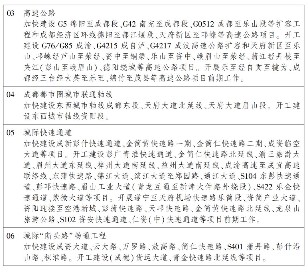 其中包括,沿成渝地区北中南三条发展轴线,依托高铁高速通道,深化与川南经济区、川东北经济区城市的协同发展,积极推进与重庆主城区及渝西、渝东北合作;突出西部陆海新通道建设,以南向至东盟铁海联运、公铁联运班列为纽带,深化与黔桂滇西南传统经济联系紧密区域合作;依托西向国际航线和中欧班列拓展国际经贸合作,建设面向欧洲及中西亚的国际市场主枢纽及重要门户;加强与关中平原城市群的对接合作,延伸拓展与中原、山东半岛城市群和华北、东北地区的交流合作,积极参与中蒙俄经济走廊建设。