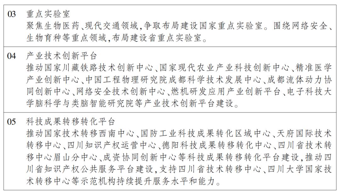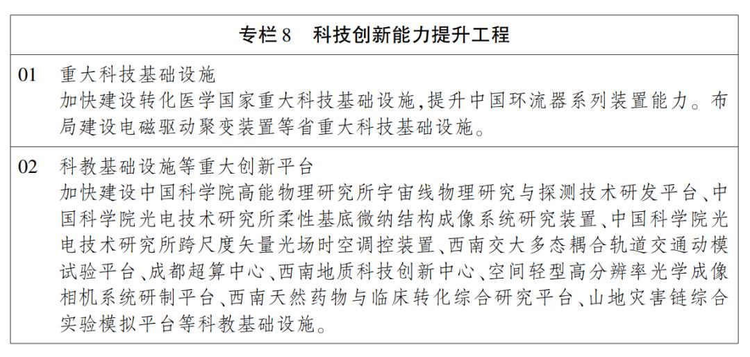在高水平建设综合性科学中心方面,《规划》提出,要突出兴隆湖周边等重点区域创新布局,积极整合优势领域科研力量,按照国家统一部署参与建设国家实验室,聚力打造重大科技基础设施集群和研究基地集群。推动成都超算中心进入国家超算中心体系,加快推动天府实验室、国家重点实验室等战略科技平台建设,建好国家实验室四川基地,吸引集聚工程研究中心、产业创新中心、技术创新中心、制造业创新中心等创新平台。加大核心电子器件、高端通用芯片及基础软件、工业软件产品等研发投入,争取更多“科技创新2030—重大项目”落地。在航空航天、精准医学、轨道交通、先进核能、集成电路、网络安全、北斗导航等重点领域开展集中攻关,探索关键核心技术攻关新模式。
