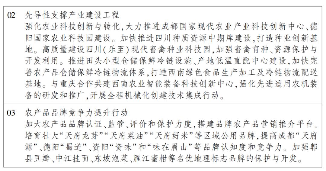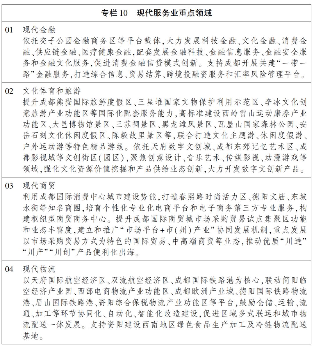 在现代服务业方面,《规划》提出要推动生产性服务业转型升级融合发展,全面提升消费供给能力。成都都市圈将扩大服务消费,建设三星堆国家文物保护利用示范区和长征国家文化公园成都段,发展数字文化体育、智慧旅游、康养体育旅游、音乐文化产业等新业态;打造春熙路—太古里等世界知名商圈,擦亮“夜游锦江”等夜间经济名片,丰富假日经济、夜间经济产品;扩大家政服务和产品有效供给,建立和推广“市场平台+市(州)产业”协同发展机制。
