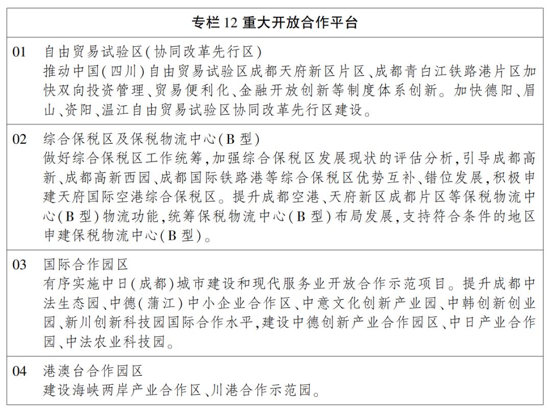 其中包括,提升成都国际航空枢纽国际竞争力,加密国际航线航班,提升中转效率,积极创建天府国际机场国家级临空经济示范区;共建“一带一路”进出口商品集散中心,加快建设四川天府新区国家级进口贸易促进创新示范区;加快成都、德阳跨境电子商务综合试验区建设,积极推进跨境电商企业对企业(B2B)出口监管试点工作;建设中国(成都)国际农产品加工产业园、眉山川港合作示范园。;共同承办成都全球创新创业交易会、中国—欧盟投资贸易科技合作洽谈会等国际性大型展会活动。